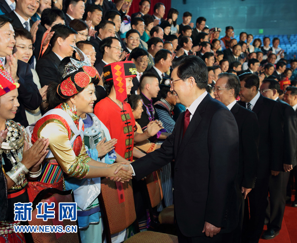 6月12日,第四屆全國少數民族文藝會演在北京國家體育館隆重開幕。胡錦濤、溫家寶、賈慶林、李長春等出席開幕式文藝晚會。演出開始前,胡錦濤等會見了參加會演的各少數民族演職人員代表。新華社發