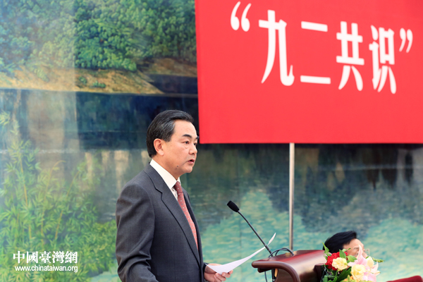 11月26日,中共中央臺灣工作辦公室、國務院臺灣事務辦公室與海峽兩岸關系協會在人民大會堂舉行“九二共識”20周年座談會。圖為中共中央臺辦、國務院臺辦主任王毅在座談會上講話。(中國臺灣網 陳佳慧 攝)
