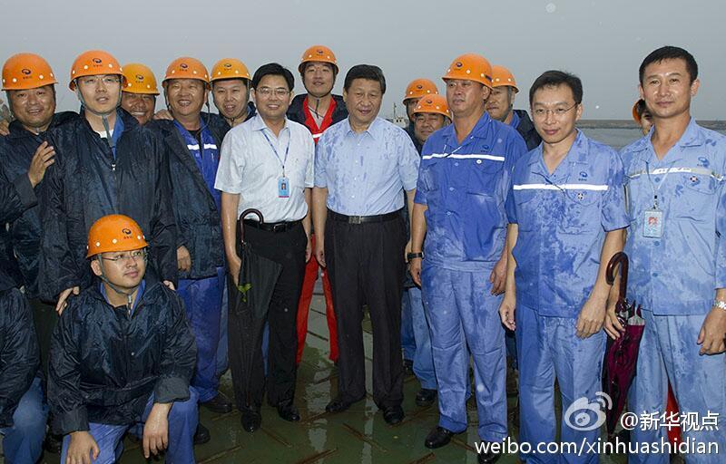 據(jù)新華社新華視點微博報道,8月28日下午5時許,習(xí)近平總書記冒雨來到大連灣畔的大連船舶重工集團了解海洋工程裝備發(fā)展情況。看見總書記來了,工人們跑了過來。“總書記,我們最大的夢想就是和您合個影。”“好,那就照吧。”看工人們都沒有傘,習(xí)近平把自己打著的傘遞給工作人員,高興地和工人們合影。