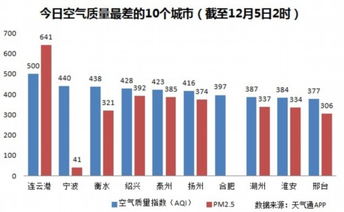 中央氣象臺監測顯示,今天白天到夜間,安徽東部和北部、江蘇、上海、浙江北部等大部地區有中度霾,其中,江蘇等地的部分地區有重度霾。截至今日早上2時,連云港的AQI(空氣質量指數)“爆表”達到500,PM2.5高達641,屬于嚴重污染,成為74個公布PM2.5數據城市中空氣質量最差的城市。