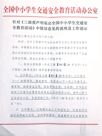 這份名為“針對《三部委聲明退出全國中小學生交通安全教育活動》中錯誤意見的說明及工作請示”中,首先回應了“未獲三部委授權”的質疑,稱安全教育辦公室是依據中國關工委[2011]20號文件對外簽署的協議,“按照指導思想聯合社會各界共同開展學生教育工作,為明確合作雙方的責、權、利,必然要簽署合作協議。”