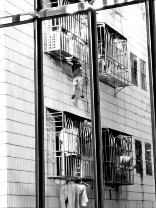 千鈞一發之際,一名30歲左右的男子沖出人群,將鞋一脫,背包一甩,沿著防護欄不到兩分鐘就徒手爬上了五樓,并迅速移動到男孩身邊。熱心男子雙腳踩著五樓的防盜網,左手拉著防盜網借力,右手不停敲擊卡著男孩的六樓防盜網,并試圖將孩子推上去。