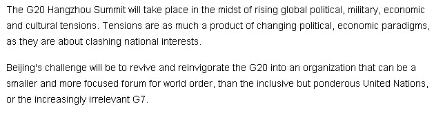 新興的多極世界格局正日漸成形。在杭州峰會這樣的中國時刻即將到來之際,中國政府應(yīng)當(dāng)采取主動,推動基礎(chǔ)設(shè)施發(fā)展在全球范圍內(nèi)達成共識,為自己的商品和服務(wù)挖掘更廣闊的市場。中國應(yīng)當(dāng)闡述其處理領(lǐng)土和貿(mào)易爭端的理念,并且向世界表明,它所提出的貿(mào)易和發(fā)展建議、互不干涉的原則和達成共識的模式,不只適用于過去,也將有助于未來。