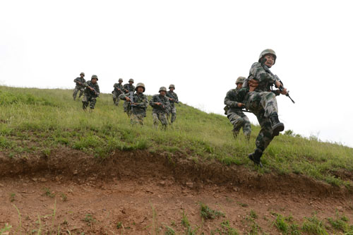 資料圖:陸軍第39集團軍某紅軍旅官兵在演習中發起沖鋒(2016年5月14日攝)。