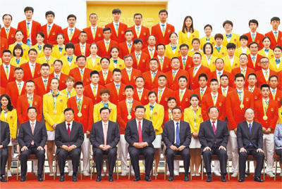 8月25日,黨和國(guó)家領(lǐng)導(dǎo)人習(xí)近平、李克強(qiáng)、張德江、俞正聲、劉云山、王岐山、張高麗等在北京人民大會(huì)堂會(huì)見第31屆奧林匹克運(yùn)動(dòng)會(huì)中國(guó)體育代表團(tuán)全體成員。新華社記者蘭紅光攝