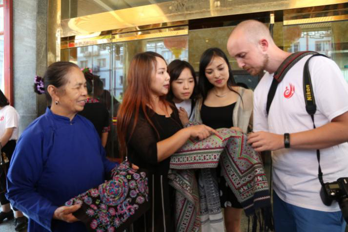 侗錦非遺傳承人石培云和呀啰耶侗錦公司總經(jīng)理歐瑞凡正在為記者展示侗錦 圖/中國(guó)青年報(bào)·中青在線記者 仵楠