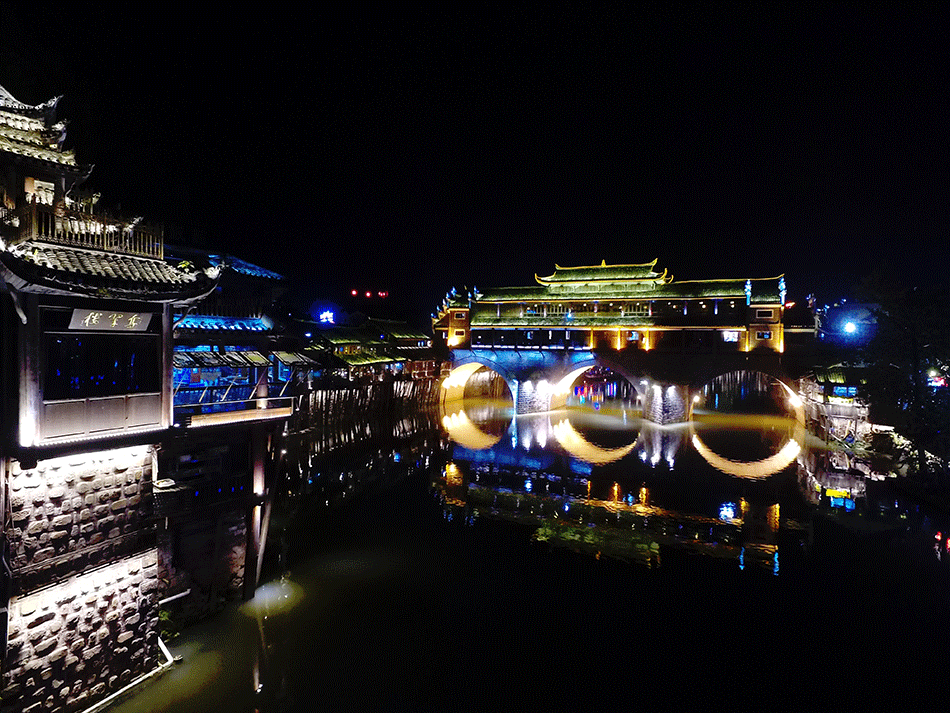虹橋旁的吊腳樓均分上下兩層,,俱屬五柱六掛或五柱八掛的穿斗式木結構,是鳳凰古城具有濃郁苗族建筑特色的古建筑群之一。新華網 王超攝