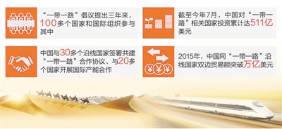“一帶一路”倡議提出三年來,100多個國家和國際組織參與其中,中國與30多個沿線國家簽署共建“一帶一路”合作協議、與20多個國家開展國際產能合作,以亞投行、絲路基金為代表的金融合作不斷深化,一批有影響力的標志性項目逐步落地。截至今年7月,中國對“一帶一路”相關國家的投資累計達511億美元。2015年,中國同“一帶一路”沿線國家雙邊貿易額突破萬億美元。從無到有、由點及面,“一帶一路”海陸統籌、東西互濟、面向全球的開放新格局漸次鋪開,建設速度和成果超出預期。
