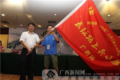 自治區(qū)網(wǎng)信辦主任金化倫向參加長(zhǎng)征行的媒體記者代表授旗。 廣西新聞網(wǎng)記者 鄧昶 攝