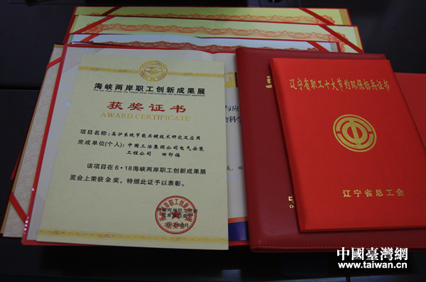 田印福曾獲得“全國職工技術創新獎”、“海峽兩岸創新成果展金獎”、“遼寧省十大創新成果獎”、“鞍山市科技進步獎”等獎項40余項,榮獲“遼寧省節約環保標兵”、“遼寧省勞動模范”、“遼寧好人”、“全國勞動模范”等諸多稱號,成為享受國務院特殊津貼的專家。圖為田印福展示的部分榮譽。(中國臺灣網 李帥 攝)