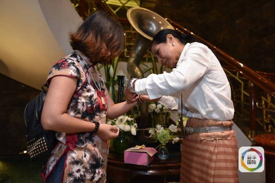 科甘(右)為楊莉佩戴象征泰國國旗三色的手鏈。(新華社記者李芒茫攝)