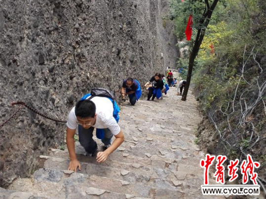 采訪團成員手腳并用,攀登薛家寨