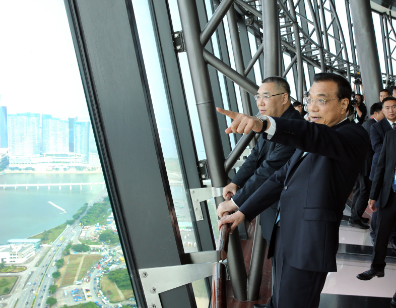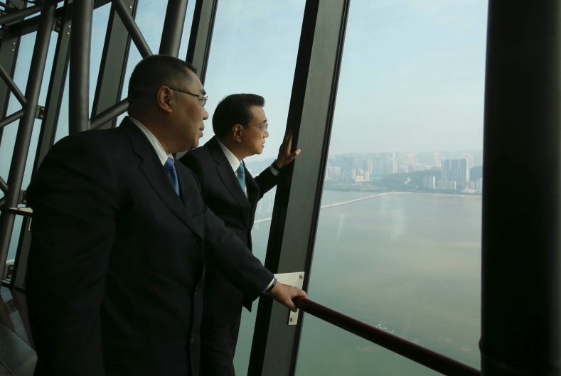 【李克強(qiáng)登上澳門旅游塔俯瞰濠江全貌】正在澳門視察的李克強(qiáng)總理,10日下午在崔世安特首的陪同下登上澳門旅游塔223米高的主觀光層,俯瞰濠江全貌,并聽取澳門促進(jìn)經(jīng)濟(jì)適度多元可持續(xù)發(fā)展的產(chǎn)業(yè)策略,以及城市發(fā)展策略的匯報(bào)。