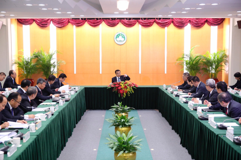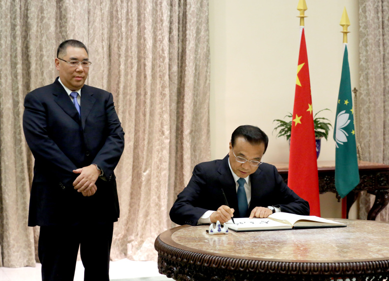 【李克強(qiáng)視察澳門特區(qū)政府總部并聽取匯報(bào)】李克強(qiáng)總理10日下午視察澳門特區(qū)政府總部,與特區(qū)政府主要官員合影,并在嘉賓簽名冊上簽名。在聽取崔世安行政長官及特區(qū)政府5位司長的工作匯報(bào)后,李克強(qiáng)作了重要講話。他說,中央政府最近根據(jù)新形勢下澳門發(fā)展的新需求,提出了多項(xiàng)惠澳政策。
