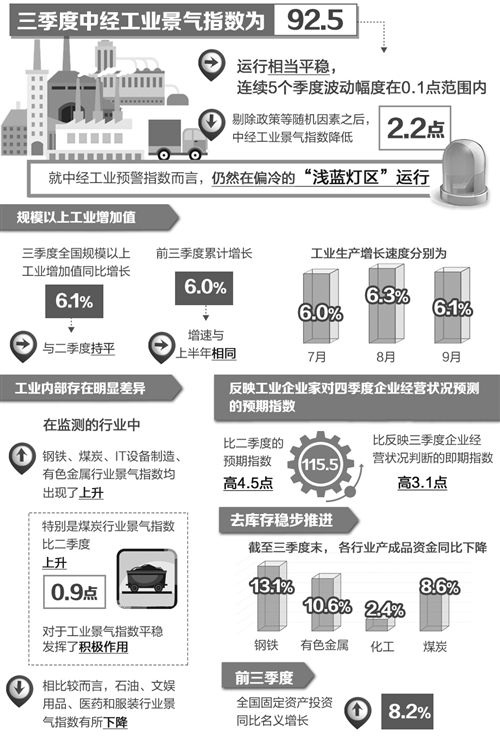 由經(jīng)濟日報社中國經(jīng)濟趨勢研究院、國家統(tǒng)計局中國經(jīng)濟景氣監(jiān)測中心、中國社科院數(shù)量經(jīng)濟與技術(shù)經(jīng)濟研究所共同編制的2016年三季度中經(jīng)產(chǎn)業(yè)景氣指數(shù)今日發(fā)布。中經(jīng)產(chǎn)業(yè)景氣指數(shù)所采集的行業(yè)涵蓋了工業(yè)領(lǐng)域的重點產(chǎn)業(yè),包括裝備制造、煤炭、石油、電力、鋼鐵、有色金屬、化工、IT設(shè)備制造、醫(yī)藥、服裝、文體娛樂用品等。本期報告重點分析今年三季度上述行業(yè)的運行情況和特點,并對今年四季度和明年一季度的發(fā)展趨勢進行預(yù)測——