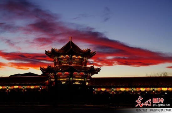 晚霞似火映紅天邊,恰逢長亭華燈齊放,在火燒云的映襯下壯美奇觀驚艷古城,美不勝收。(吳紅軍攝/光明圖片)