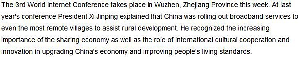 第三屆世界互聯網大會將于本周在浙江烏鎮舉行。在去年的大會上,中國國家主席習近平表示,中國將在偏遠山村普及網絡寬帶,促進農村地區發展。他肯定了共享經濟的重要性,以及國際文化合作和創新在中國經濟升級和改善民眾生活中所扮演的角色。
