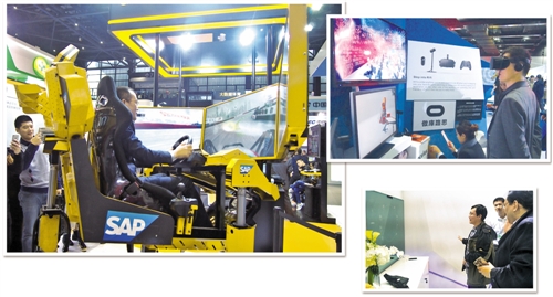 ▲ “互聯網之光”博覽會上,觀眾正在體驗SAP的智能運輸解決方案,特殊的T恤衫上裝有人體傳感器,能夠記錄司機的生理數據和駕駛動作。