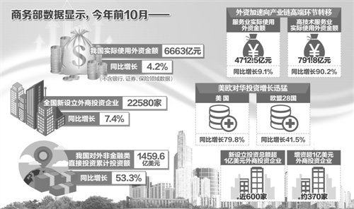 此外,新設(shè)立及增資的大型企業(yè)數(shù)量增多。前10月,新設(shè)立投資總額超過(guò)1億美元的大型外商投資企業(yè)近600家,增資超1億美元的外商投資企業(yè)約370家。同期,美歐對(duì)華投資增長(zhǎng)迅猛,美國(guó)、歐盟28國(guó)對(duì)華投資同比分別增長(zhǎng)79.8%和41.5%。