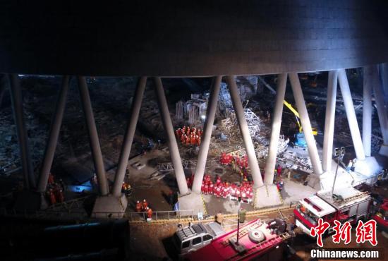 11月24日晚,搜救人員正在現場對失聯人員進行搜救。當天上午7時30分許,江西省宜春豐城電廠三期擴建工程D標段冷卻塔平橋吊倒塌,造成模板混凝土通道坍塌。
