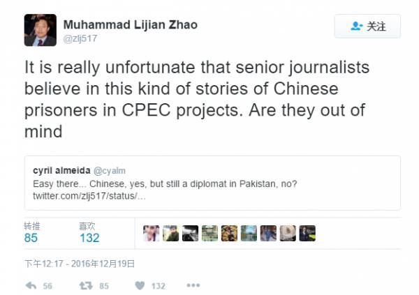 “中國外交官反擊對中巴經濟走廊的批評”,據巴基斯坦《黎明報》和印度電視臺等20日報道,針對巴基斯坦一些人無端指責中巴經濟走廊項目“存在腐敗、不均等、不透明、使用中國囚犯”等,中國駐巴基斯坦大使館臨時代辦趙立堅近日與《黎明報》記者在推特上展開“公開論戰(zhàn)”。趙立堅稱,中巴經濟走廊得到了大多數巴基斯坦民眾的認可,運作良好,但一些人出于不可告人的目的,傳播虛假消息。