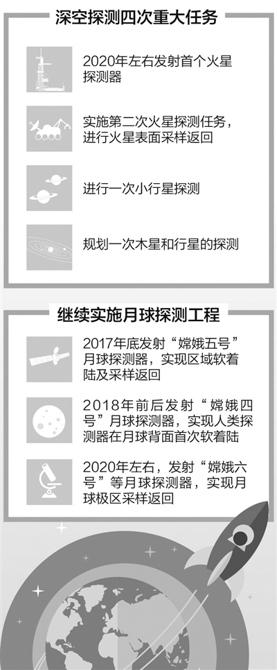 他透露,未來的深空探測工程還將實施四次重大任務。一是2020年左右發射首個火星探測器,按照一步實現繞、落、巡開展火星探測;二是實施第二次火星探測任務,進行火星表面采樣返回,開展火星構造、物質成分、火星環境等科學分析與研究;三是進行一次小行星探測;四是規劃一次木星和行星的探測。