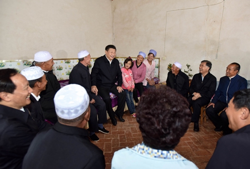 2016年7月18日,習近平在寧夏固原市涇源縣大灣鄉楊嶺村村民馬克俊家同一家人和村民代表親切交談。