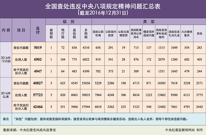 為掌握全國貫徹落實(shí)中央八項(xiàng)規(guī)定精神情況,中央紀(jì)委在31個(gè)省區(qū)市和新疆生產(chǎn)建設(shè)兵團(tuán)、139個(gè)中央和國家機(jī)關(guān)、102個(gè)中央企業(yè)、15個(gè)中央金融企業(yè)建立了落實(shí)中央八項(xiàng)規(guī)定精神情況月報(bào)制度。2016年以來,截至12月31日,全國查處違反中央八項(xiàng)規(guī)定精神問題情況如下: