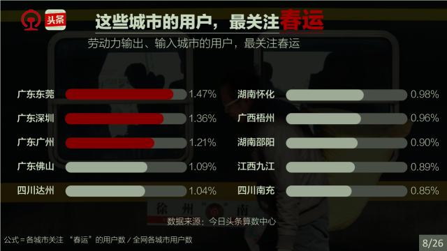 春運是社會,春運是文化,春運縮影國與家。一年一度的春運,承載著國人的情感、目光和腳步。他們在關注著什么,他們的出行有什么規律,哪些城市、哪些人群又和春運關聯度最高。中國鐵路和今日頭條通過對2017年春運鐵路購票數據和今日頭條客戶端閱讀數據的分析,告訴你一個縮影國與家的春運。
