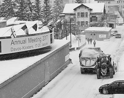 2017年達沃斯論壇在即,圖為工人們正在清掃論壇會場附近的積雪。劉軍攝/光明圖片