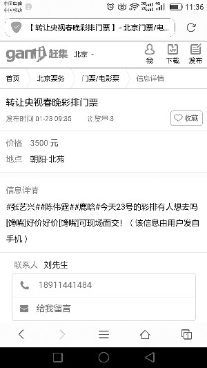 昨天,記者在58同城、閑魚等多家網(wǎng)絡(luò)平臺(tái)上看到有人出售春晚彩排門票。在趕集網(wǎng)上搜索“春晚彩排門票”,頁面上會(huì)跳出六七條相關(guān)帖子。其中一則“轉(zhuǎn)讓央視春晚彩排門票”的帖子,提示當(dāng)紅明星鹿晗、張藝興彩排等信息,標(biāo)注的價(jià)格為3500元。