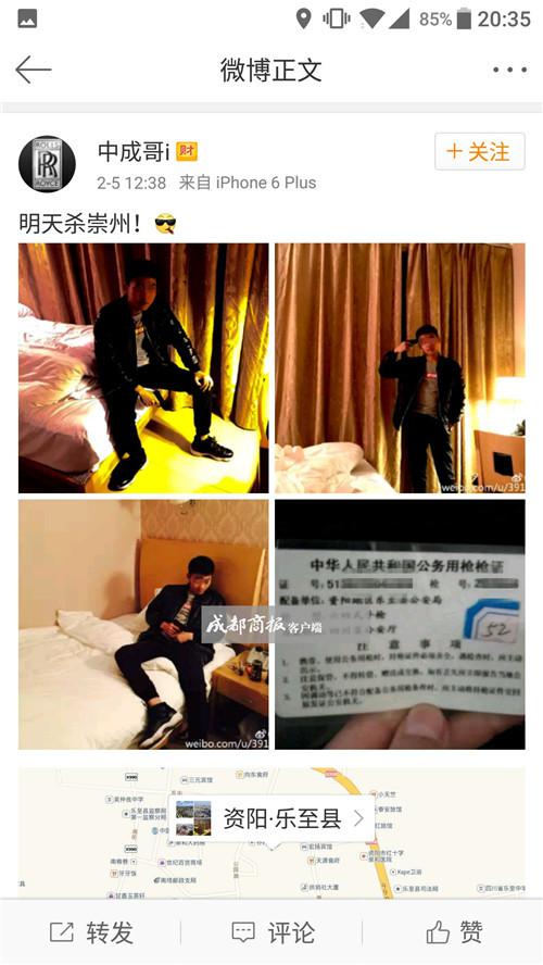 6日,該微博已被發布者“中成哥i”刪除。但根據報料者截圖,“明天殺崇州!”的微博發布于2月5日12時38分,微博發布時的定位為資陽市樂至縣公園路附近。4張配圖中,有3張同一小伙在賓館內持槍的圖片,另有1張圖片為“中華人民共和國公務用槍槍證”,上面能清晰地看出證號、槍號、配備單位、槍型和發證機關!爸腥A人民共和國公務用槍槍證”顯示,槍支配備單位為資陽地區樂至縣公安局,槍型為六四式手槍,發證機關為四川省公安廳。