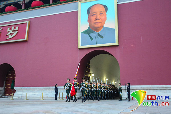 國旗護(hù)衛(wèi)戰(zhàn)士保衛(wèi)著國旗走出天安門。中國青年網(wǎng)記者 李拓 攝