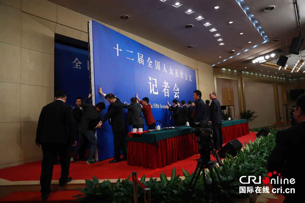 國際在線消息(記者 沈湜):2017年3月7日上午,十二屆全國人大五次會議新聞中心在梅地亞中心多功能廳舉行記者會,在上午的全國人大記者會結(jié)束后,新聞中心的工作人員馬上為下午舉行的全國政協(xié)新聞發(fā)布會更換背景板。