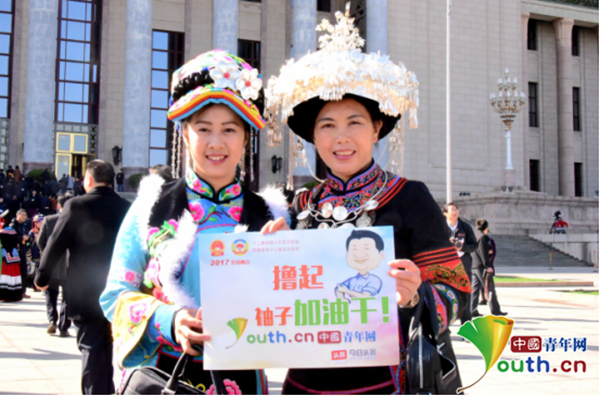 全國人大代表王安蘭(左)為“擼起袖子加油干!”點贊。中國青年網(wǎng) 劉洪俠攝