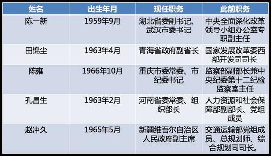 從中央到地方任職的5人中,4人為“60后”,2人為“65后”。其中,最年輕的是重慶市委常委、紀(jì)委書(shū)記陳雍,51歲,此前擔(dān)任監(jiān)察部副部長(zhǎng)。