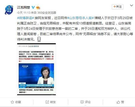 #微博辟謠# 接網友舉報,近日網傳山東辱母殺人案嫌疑人于歡已于3月29日被判屬正當防衛,當庭無罪釋放,并配有央視13頻道報道截圖。經查證,山東省高院于3月24日受理于歡故意傷害一案的二審,并于28日通知雙方辯護人、訴訟代理人查閱案卷,目前二審結果尚未公布,網傳“無罪釋放”消息不實,請大家耐心等待判決情況。