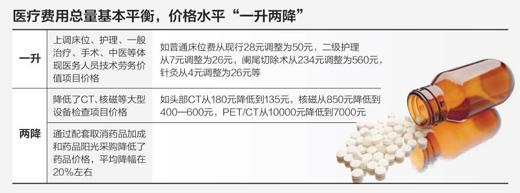 北京市衛生計生委新聞發言人高小俊介紹說,調整后患者費用總體負擔水平沒有增加。改革保持全市醫療費用總量基本平衡,價格水平“一升兩降”:上調床位、護理、一般治療、手術、中醫等體現醫務人員技術勞務價值項目價格;降低了CT、核磁等大型設備檢查項目價格;降低了藥品價格。高小俊舉例說,如普通床位費從現行28元調整為50元,二級護理從7元調整為26元,闌尾切除術從234元調整為560元等;頭部CT從180元降低到135元,核磁從850元降低到400—600元,PET/CT從10000元降低到7000元;而通過配套取消藥品加成和藥品陽光采購,藥品價格平均降幅20%左右。