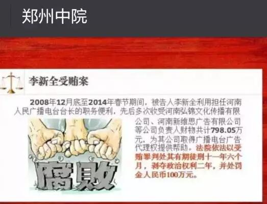 2017年4月11日上午,在鄭州市第十四屆人民代表大會第五次會議上,鄭州市中級人民法院院長于東輝作工作報告。鄭州中院官方微信公號同時刊發小編解讀報告中那些大案要案。 其中顯示,河南人民廣播電臺原臺長李新全受賄案。