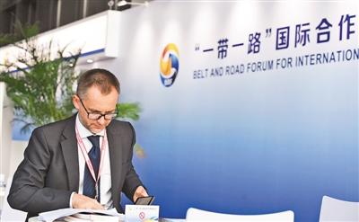 12日,一位參與報道的外國記者在“一帶一路”國際合作高峰論壇新聞中心忙碌。