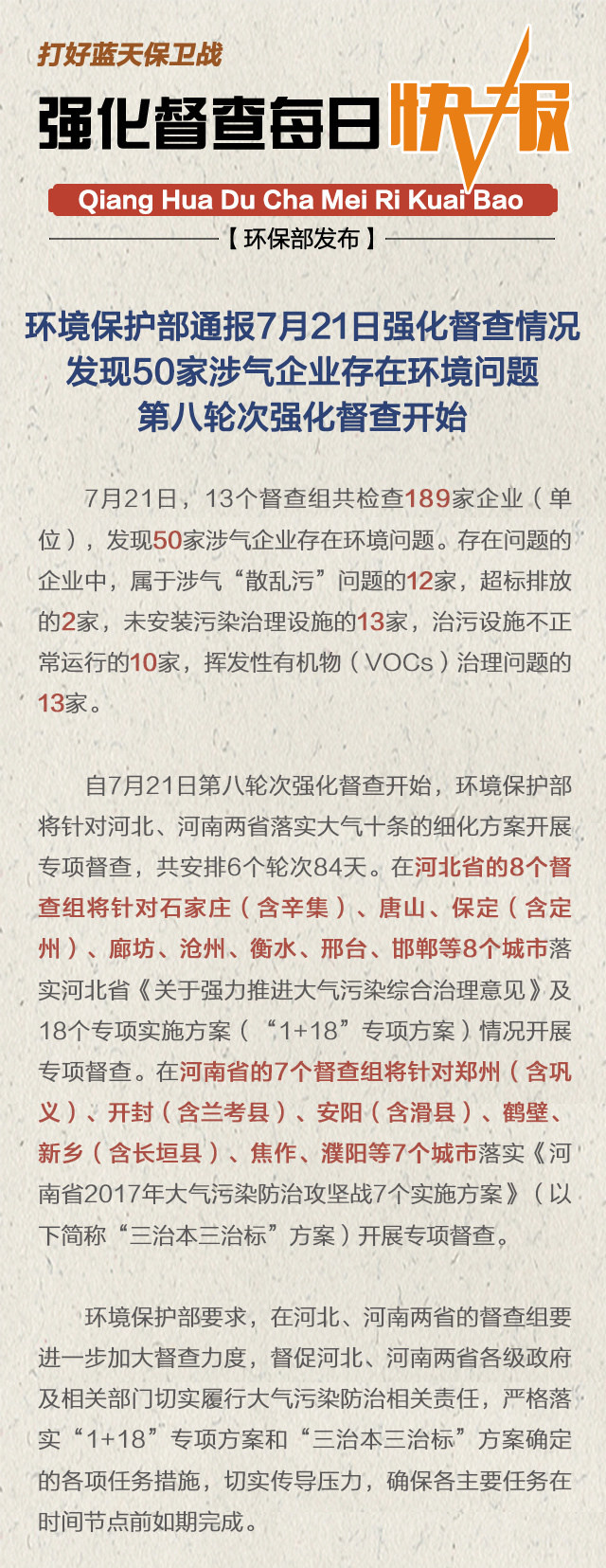 自7月21日第八輪次強化督查開始,環(huán)境保護部將針對河北、河南兩省落實大氣十條的細化方案開展專項督查,共安排6個輪次84天。