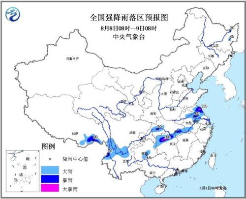 據(jù)中央氣象臺網(wǎng)站消息,中央氣象臺8月8日06時繼續(xù)發(fā)布暴雨藍(lán)色預(yù)警:預(yù)計8月8日08時至9日08時,重慶東北部、湖北西部和東南部、湖南北部、安徽東北部和西南部、江蘇中北部以及西藏東南部、云南西北部等地的部分地區(qū)有大雨或暴雨,其中湖南北部、江蘇東北部等地的局部地區(qū)有大暴雨(100~150毫米);上述地區(qū)有短時強(qiáng)降水,局地伴有雷暴大風(fēng)等強(qiáng)對流天氣,最大小時雨強(qiáng)可達(dá)50~80毫米。
