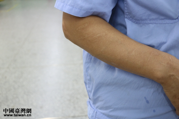張國華的手臂在工作中留下了大大小小數不清的傷疤。(中國臺灣網 張麗媛 攝)
