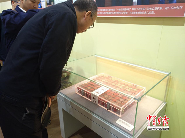 在第三展區(qū),天津市濱海新區(qū)行政審批局辦事大廳封存的109枚審批公章吸引了許多參觀者的駐足。據(jù)工作人員介紹,2014年5月20日,天津市濱海新區(qū)行政審批局掛牌成立,原來分散在18個不同部門的216項審批職責歸并到了1個部門,1枚公章取代了109枚公章,“這109枚公章真實見證了政府簡政放權(quán)的過程。”
