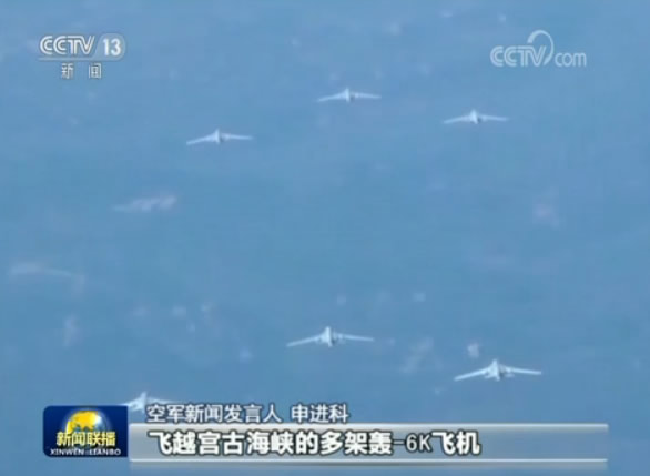 空軍新聞發言人 申進科:飛越宮古海峽的多架轟-6K飛機,從關中腹地某機場起飛,編隊前出第一島鏈;飛越巴士海峽和南海戰斗巡航的多架多型轟炸機,從部署機場起飛編隊前出;所有飛機當天完成訓練任務和戰斗巡航。