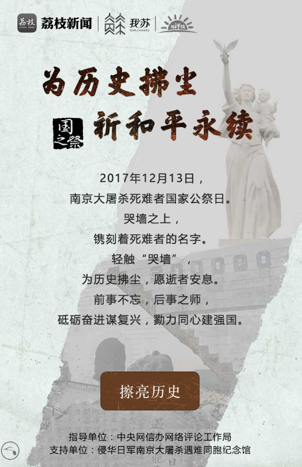 為了永不忘卻的紀念,2017年國家公祭日來臨之際,荔枝新聞和我蘇客戶端推出特別策劃“為歷史拂塵,祈和平永續(xù)”互動。愿擦亮的名字守護歷史的真相,愿和平的祈愿溫暖寒冬的殤城。