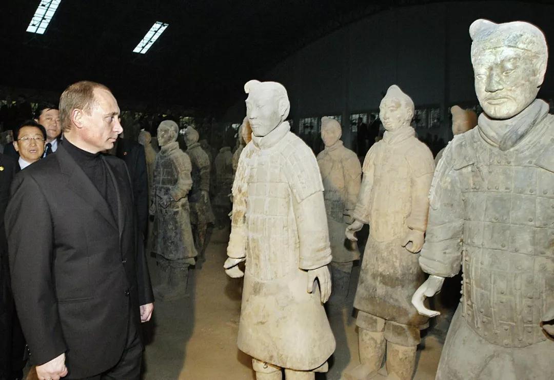 2004年10月,俄羅斯總統(tǒng)普京來到秦始皇兵馬俑博物館進行參觀。情報人員出身的普京觀察力很強,提出了很多經(jīng)典的問題:“陶俑的鞋子為什么各不相同?”“陶俑的身后怎么帶著兩個環(huán)?”“秦朝的馬為什么都不高?”“這個部位怎么沒裝兵器?”