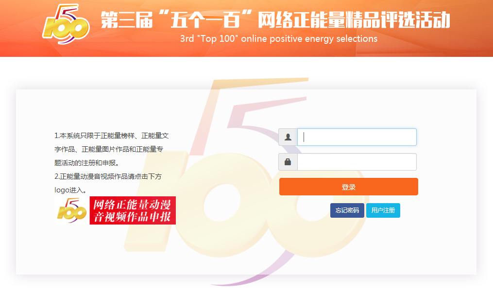 第三屆“五個一百”網絡正能量精品評選活動申報頁面