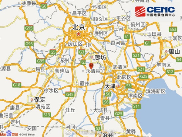 2018年2月12日18時(shí)31分,河北省廊坊市永清縣發(fā)生4.3級(jí)地震,圖為震中位置。(圖片來(lái)源:中國(guó)地震臺(tái)網(wǎng))