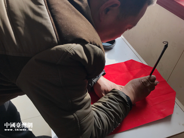 2月15日,邯鄲市永年區許莊村,記者張亞靜的父親正在書寫春聯。(中國臺灣網 張亞靜 攝)